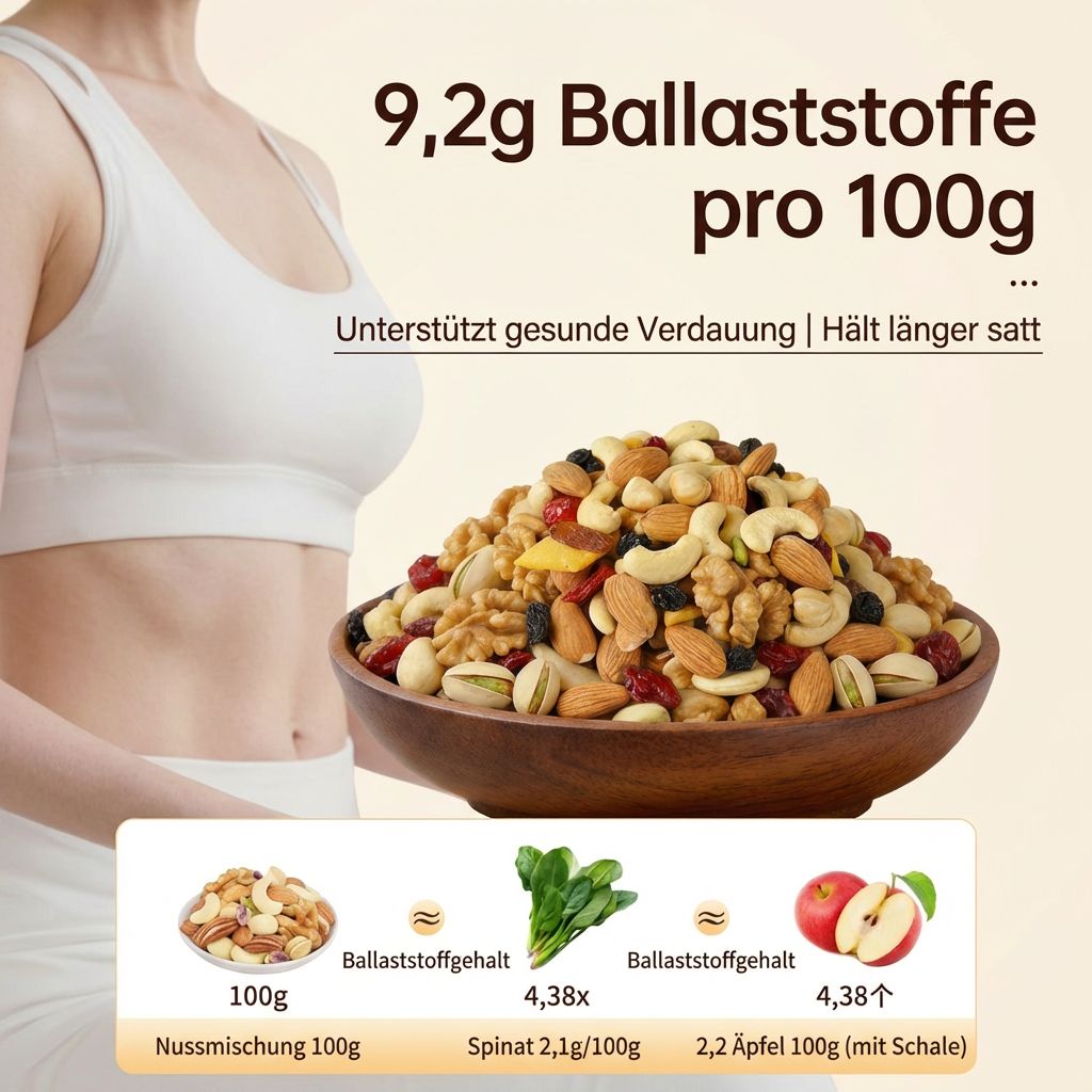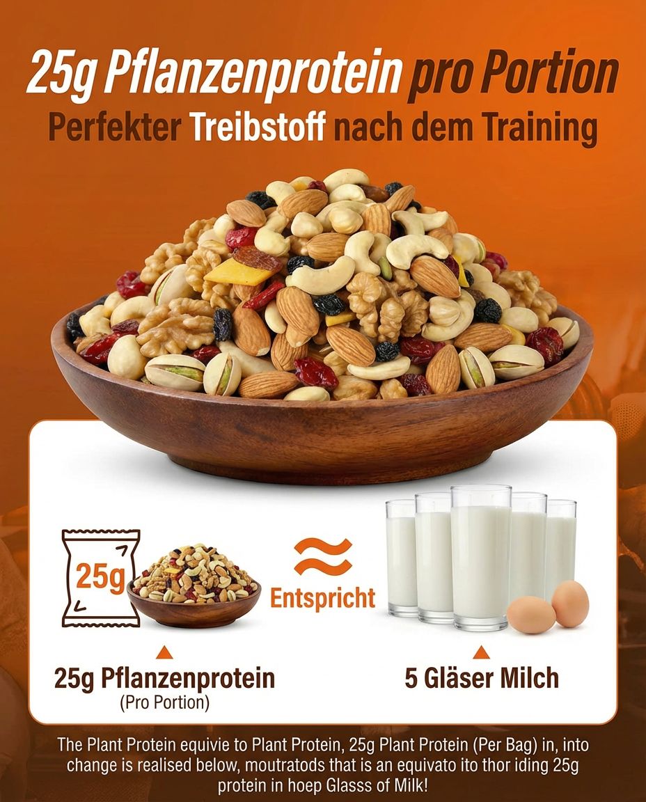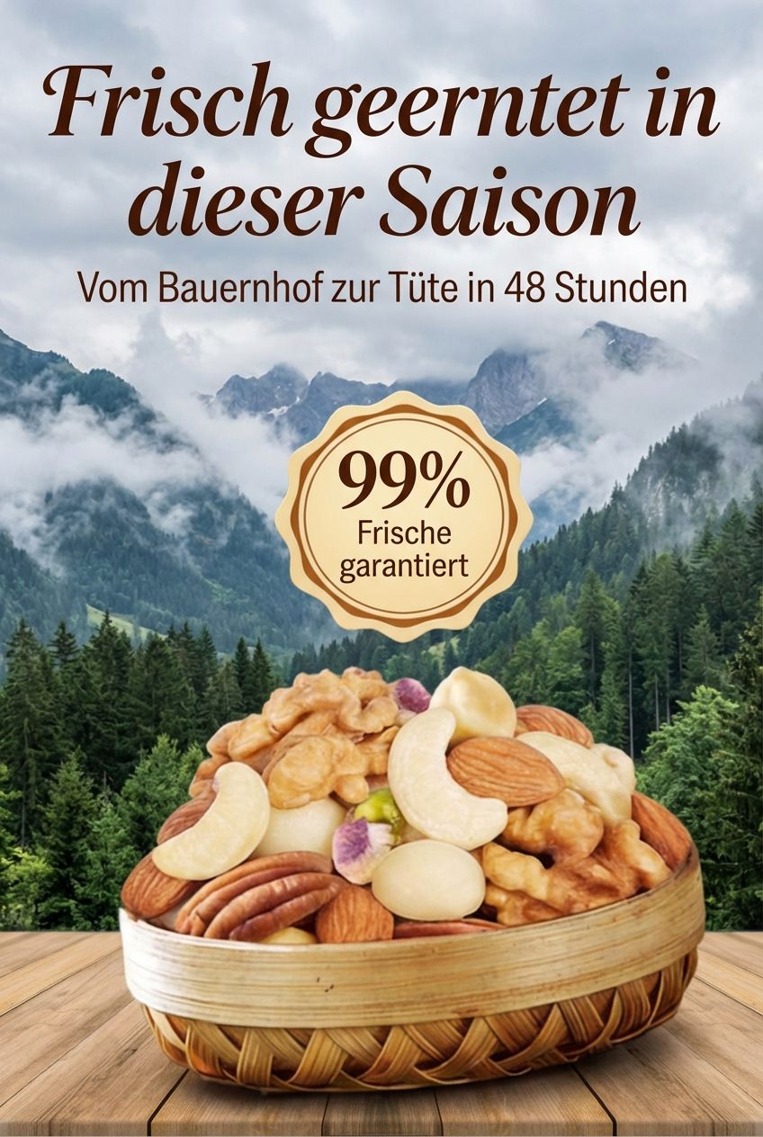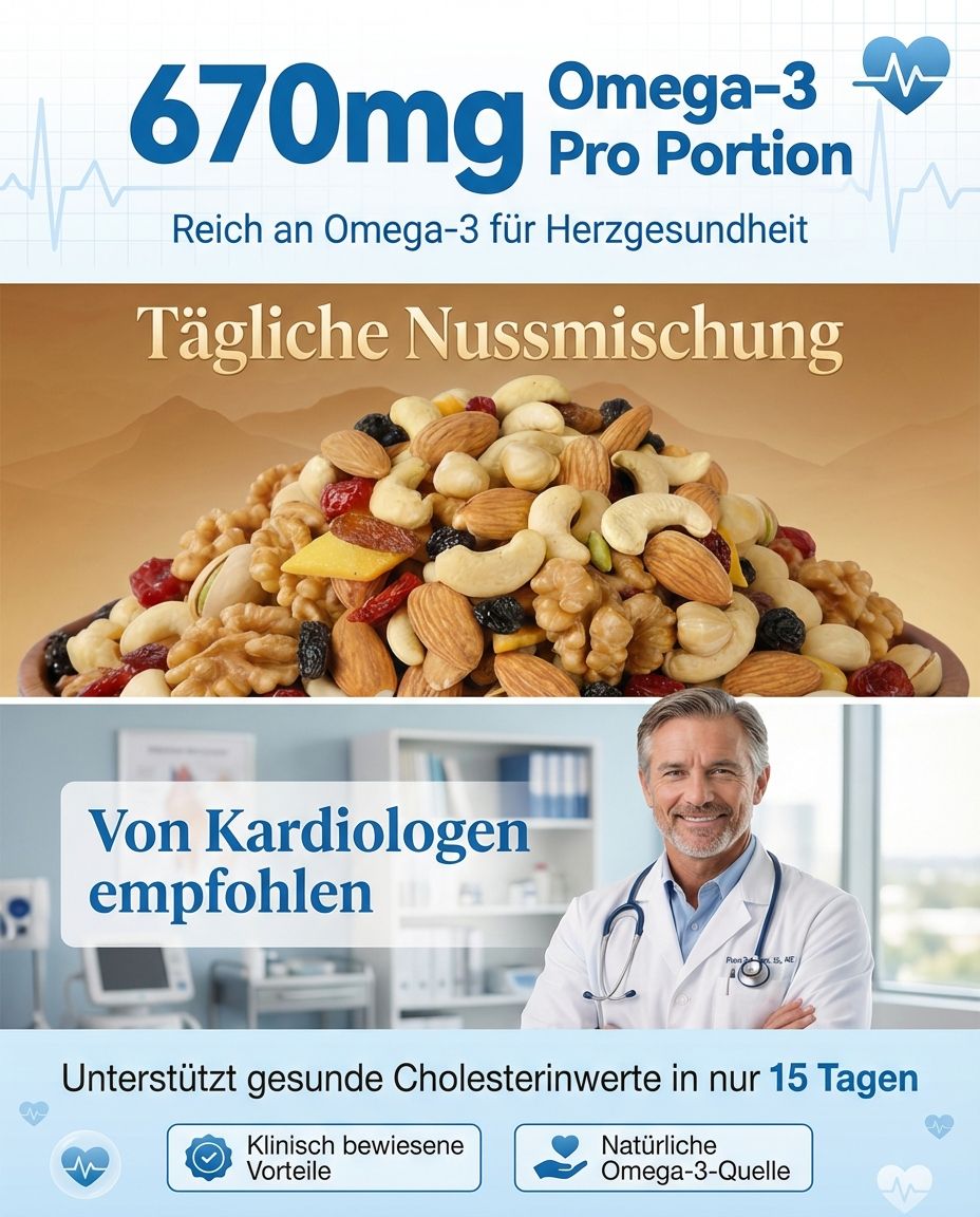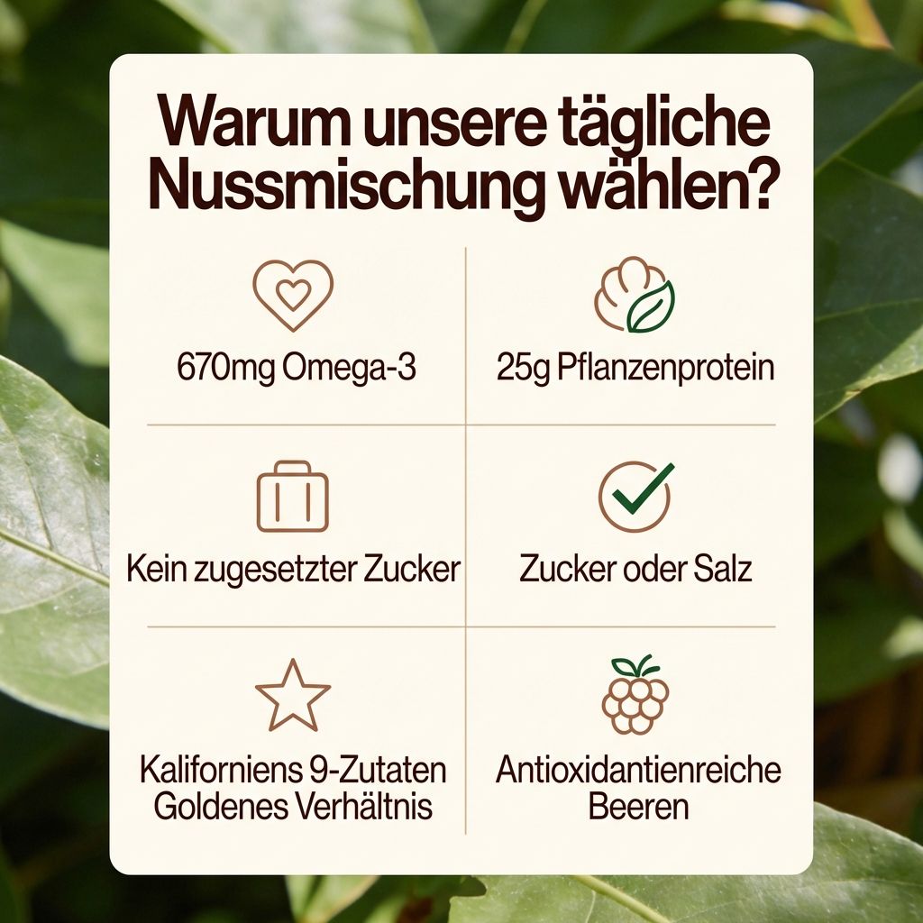 je Packung 670 mg herzschützendes Omega‑3 🫀 & 25 g pflanzliches Eiweiß 💪✨. 9 hochwertige Nussarten + 2 Beerenarten 🫐, frisch geerntet und innerhalb von 48 Stunden verpackt, 99 % Frische garantiert 🔒. Natürlich getrocknet, kein Altergeschmack, nicht fettig, knackig im Geschmack 😋, 0 Zusatzstoffe, 0 Zucker, keine künstlichen Süßstoffe ❌🍬, geeignet für Senioren und Kinder 👨👩👧👦.