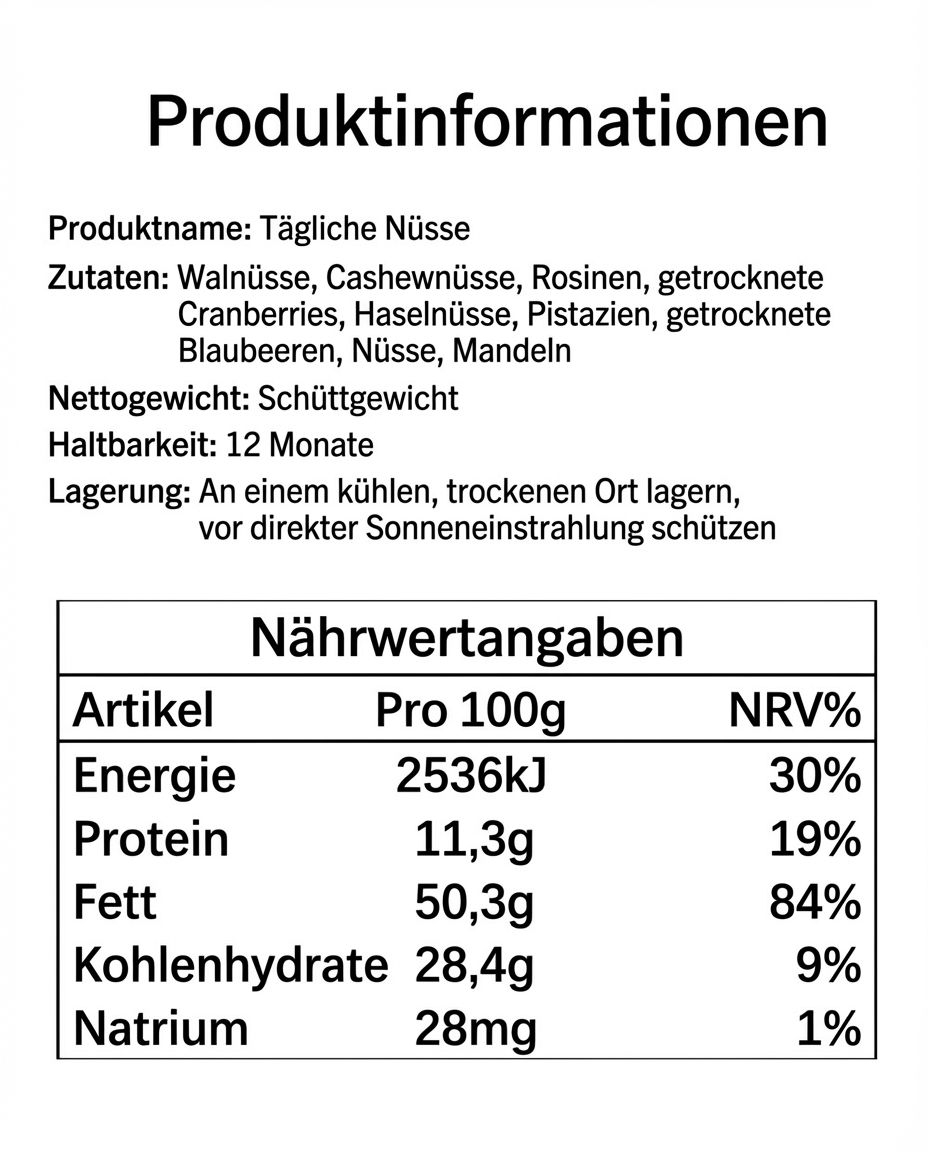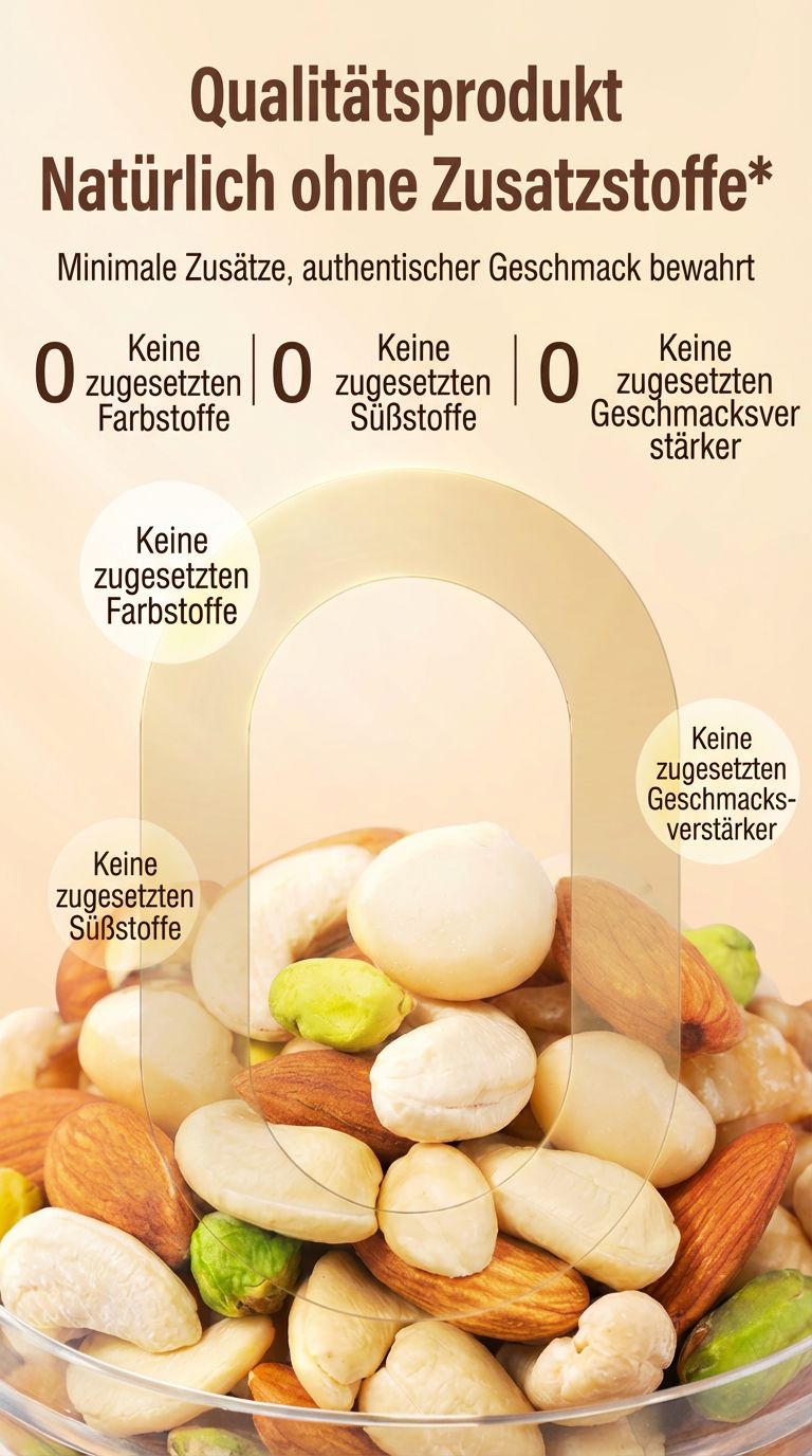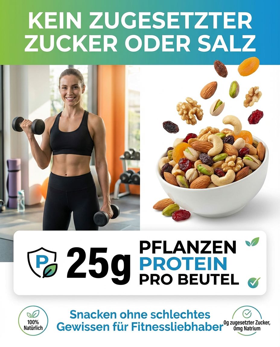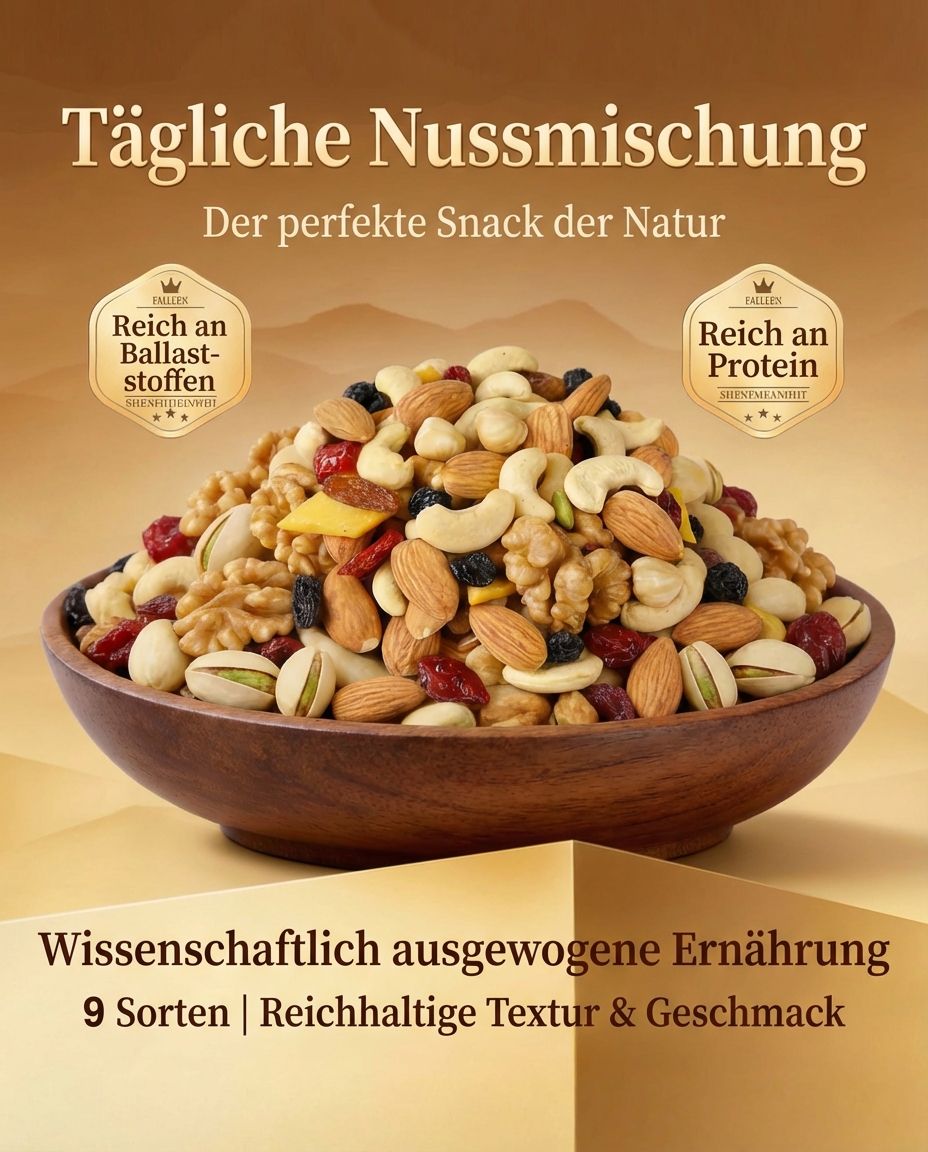 je Packung 670 mg herzschützendes Omega‑3 🫀 & 25 g pflanzliches Eiweiß 💪✨. 9 hochwertige Nussarten + 2 Beerenarten 🫐, frisch geerntet und innerhalb von 48 Stunden verpackt, 99 % Frische garantiert 🔒. Natürlich getrocknet, kein Altergeschmack, nicht fettig, knackig im Geschmack 😋, 0 Zusatzstoffe, 0 Zucker, keine künstlichen Süßstoffe ❌🍬, geeignet für Senioren und Kinder 👨👩👧👦.